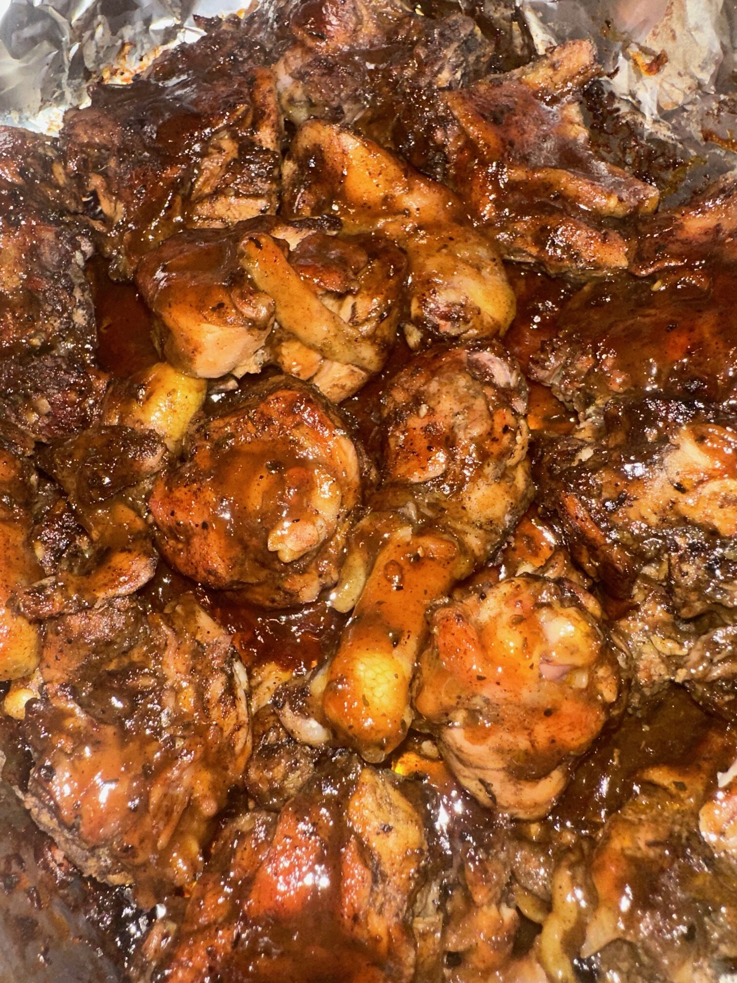 Smoky jerk-marinated chicken grilled over open flame with a tangy BBQ glaze.