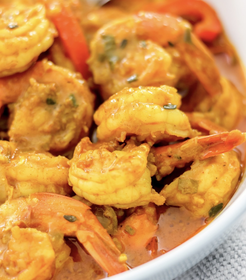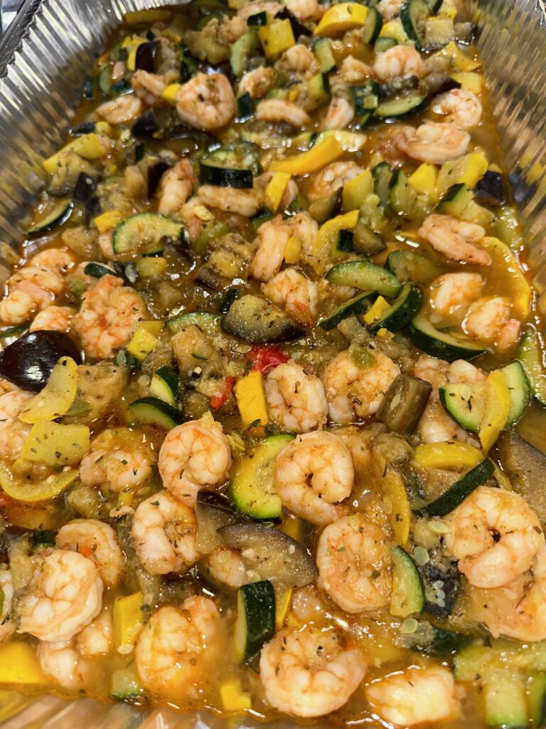 The honey coconut shrimp is cooked in spices, herbs, and coconut milk with zucchini and eggplant and drizzle in honey.