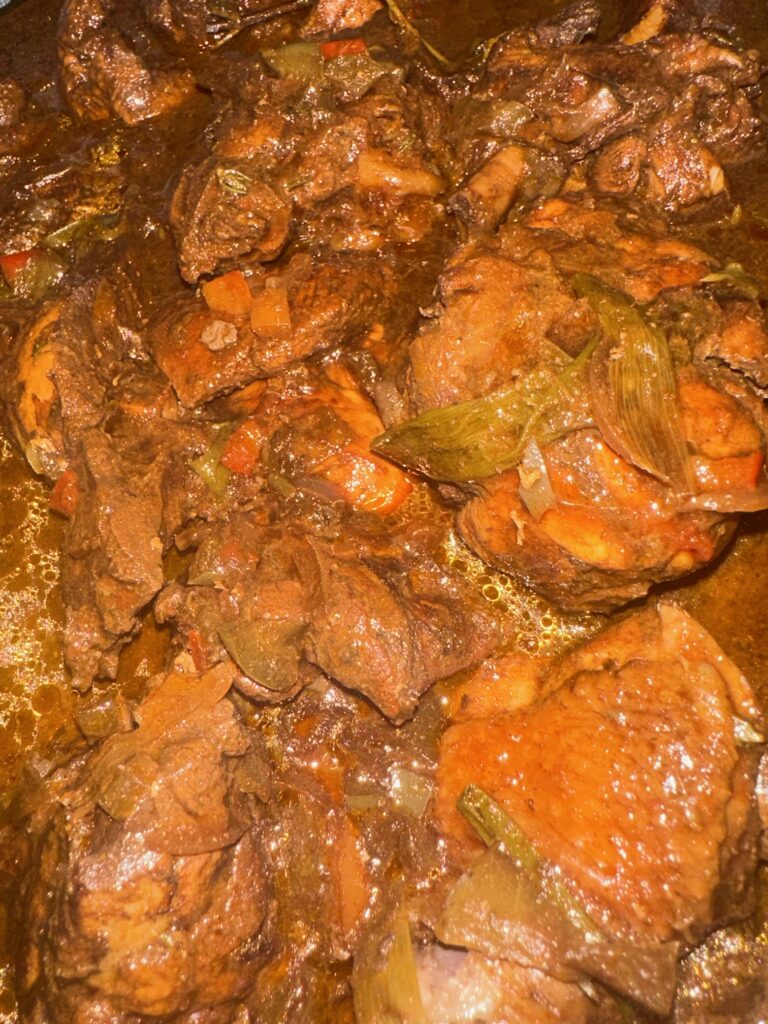 Tender chicken braised in a rich, savory Jamaican brown stew with herbs and aromatics.